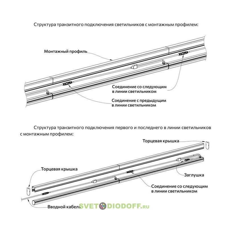 Светильник комплектуется монтажным профилем, в котором размещаются элементы проводки, используемые для транзитного подключения.