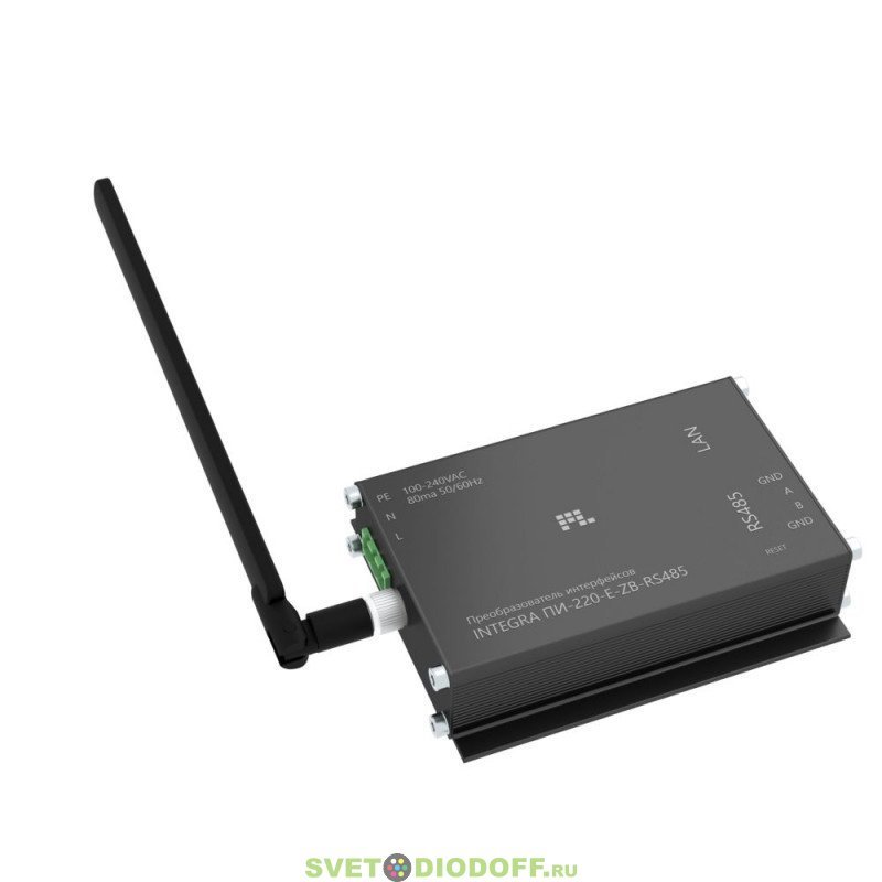 Основным назначением преобразователя интерфейсов Integra ПИ-220-E-ZB-RS485, связывающегося с сервером (пульт-сервером) системы управления освещением Integra по интерфейсу Ethernet, является преобразование протокола передачи данных в беспроводной Zigbee, работающий на частоте 2,4 Ггц.