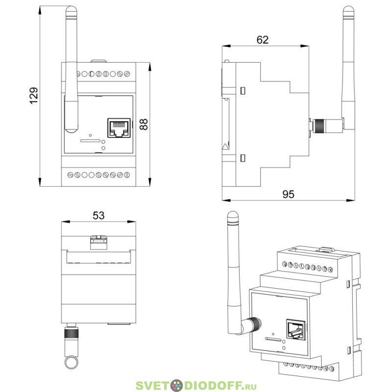 Преобразователь оснащен входным интерфейсом Ethernet для альтернативного проводного подключения к серверу системы управления, входным интерфейсом RS-485 для приема данных, передаваемых по протоколу Modbus (например, счетчиком потребляемой электроэнергии или кнопочной панелью выбора сценария освещения, при наличии у них технической возможности передавать данные по упомянутому протоколу). Также, наличие у преобразователя 2-ух релейных выходов обеспечивает возможность управления с сервера системы питанием устройств (требуется наличие силового контактора на управляемой группе электроснабжения).