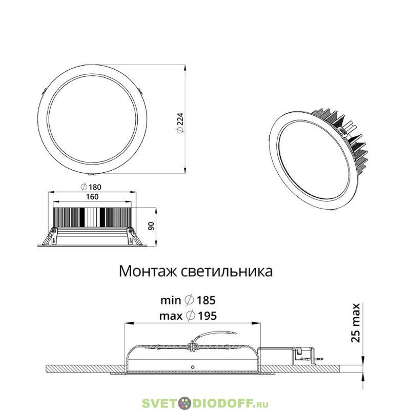 Встраиваемый светодиодный светильник влагозащищенный IP54 Даунлайт 50 L, 50Вт, 6320Лм, 3000К Теплый, Опал, 224×180х90мм