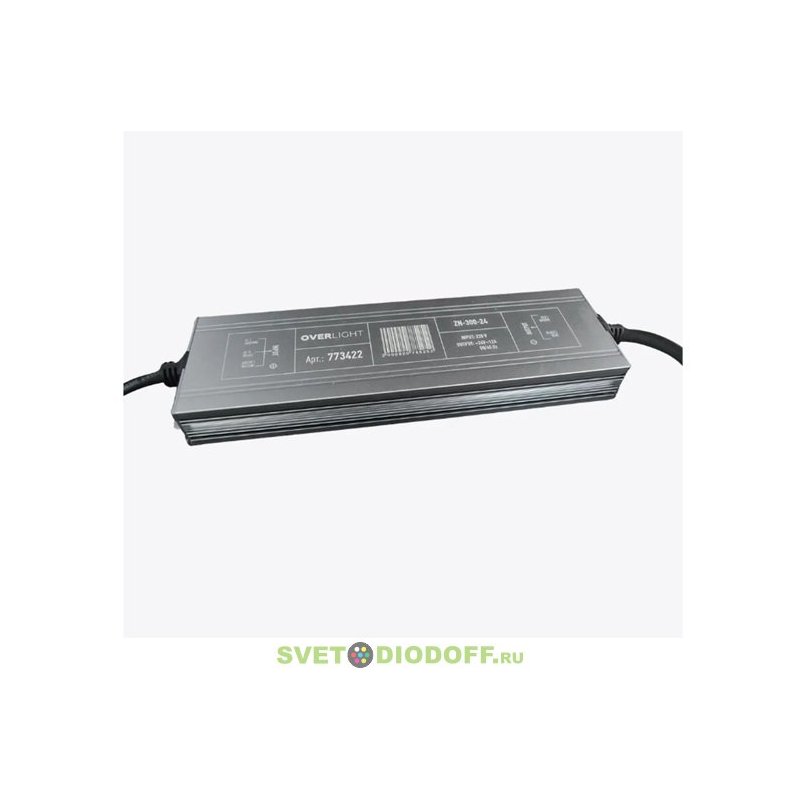 Импульсный блок питания для светодиодных лент и линеек. Входное напряжение: 90-250V. Выходное напряжение: 24V. Мощность: 300Вт. Степень защиты: IP67. Размеры: 239x72x29мм.