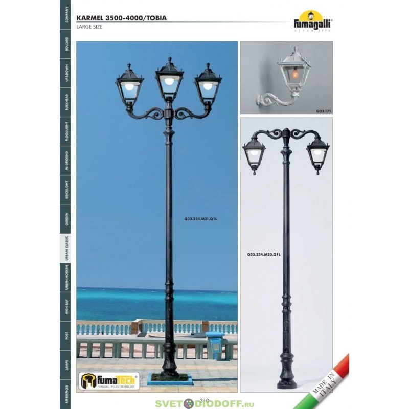 Консоль паркового фонаря на стену FUMAGALLI серии ADAM, модель ADAM SYS 2L. Классическая консоль на столб большого размера для двух парковых светильников средней или большой серии. Посадочный диаметр для консоли(на столб) и светильников - 60 мм, фиксация с помощью стопорных винтов. Монтаж в положение "вверх" и "вниз". Дизайн классический, имитация чугунного литья или ковки. Изготовлена по технологии FUMATECH, с использованием материалов с разными физическими свойствами. В центре кронштейнов расположены стальные, оцинкованные с двух сторон трубки, (внутри проходят провода), которые придают им дополнительную прочность и жесткость. С внешней стороны используется сверхпрочный технологичный полимерный материал RESIN, который защищает поверхность от агрессивного воздействия всех атмосферных факторов (покрытие не ржавеет, не выгорает на солнце, не боится солей и реагентов). Не проводит электричество!!! Кронштейн и светильники на ней не требуют заземления и относятся к 2 классу электробезопасности. Срок службы - не менее 20 лет. Температура эксплуатации от -60 до +90. Для установки парковых фонарей FUMAGALLI на стену можно использовать консоли ADAM WALL (стена).