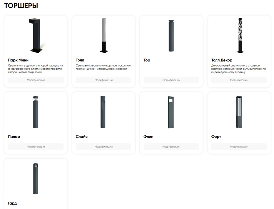 Серия уличных светодиодных светильников для ландшафтного освещения: Парк Мини. Толл, Тор, Толл Декор, Пилар, Слайс, Флип, Форт, Гард