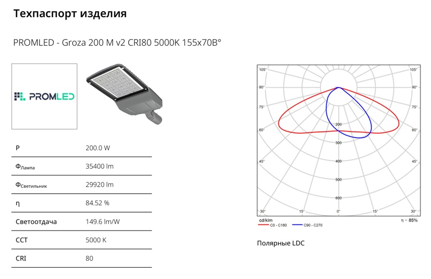Вариант на 6 опорах. Светотехнический расчет (СТР) выполнен с коэффициентом эксплуатации 0,8 на соответствие требований заказчика: