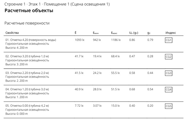 - Средняя освещенность Еср поверхности воды не менее 1000 лк.
