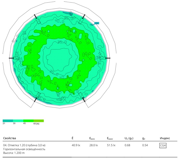Монтажная высота светильников 3,1 м над уровнем воды. Наклон консолей -- 30°; вылет консолей – 0,5 м. В проекте использовано 6 опор и 6 светильников с Тцв 5000К с CRI80.