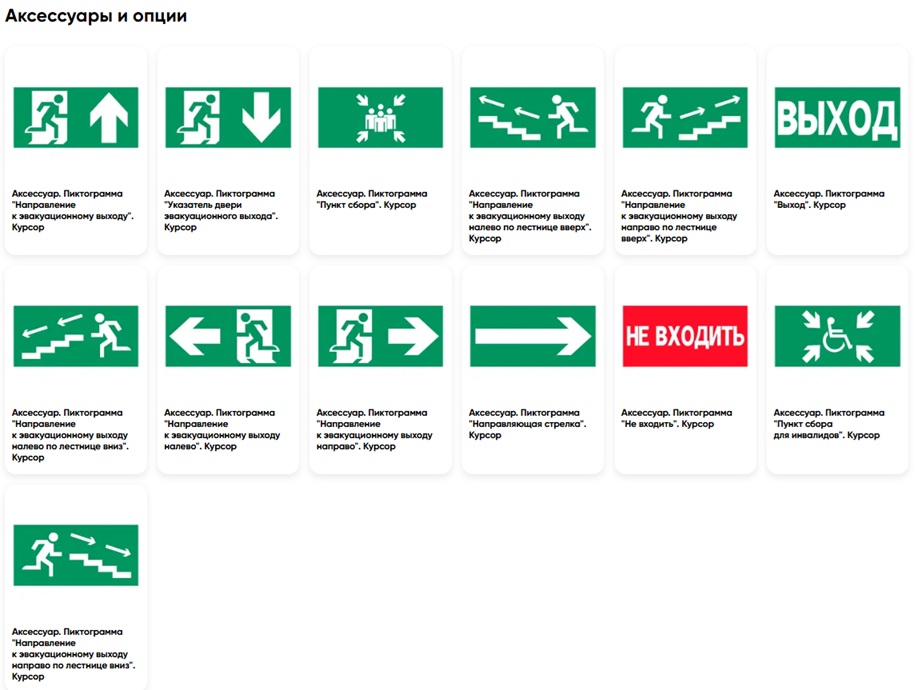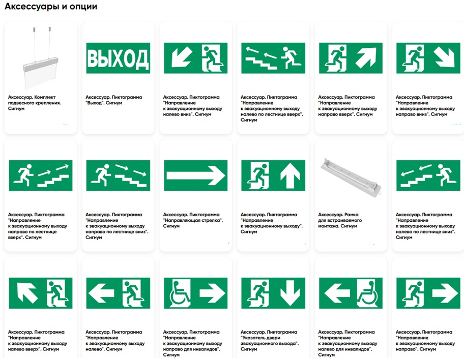 Световые указатели «Сигнум» поставляются в комплекте со светоотражающей наклейкой и накладными креплениями. Пиктограммы заказываются отдельно.