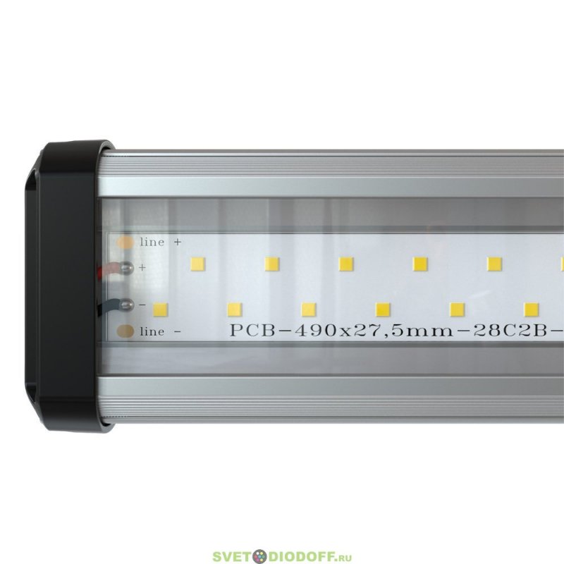В светильниках «Т-Линия Компакт Низковольтный» используются светодиодные планки на специальной алюминиевой подложке, изготовленные по технологии SMT. Светодиодная планка максимально приближена к рассеивателю, чтобы сократить потери светового потока.