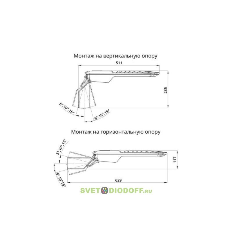 КреплениеСветильники оснащены поворотным креплением, которое позволяет устанавливать их как на консольную, так и на торшерную опору. Крепление позволяет регулировать угол наклона светильника в диапазоне ±15° с шагом 5°.