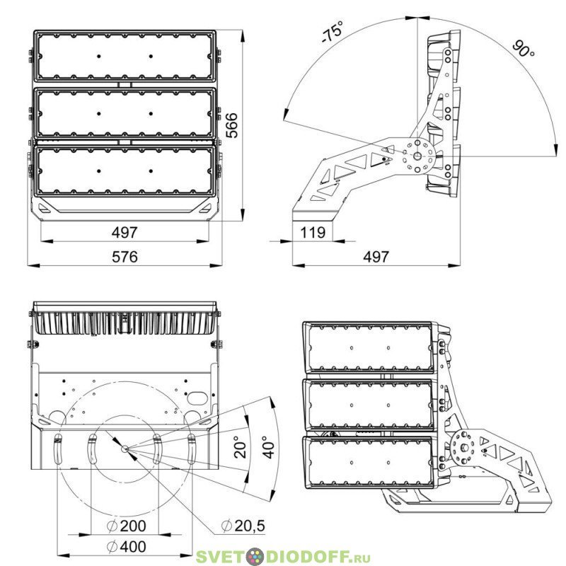 Прожектор крепится на универсальный поворотный кронштейн с возможностью регулировки угла наклона.