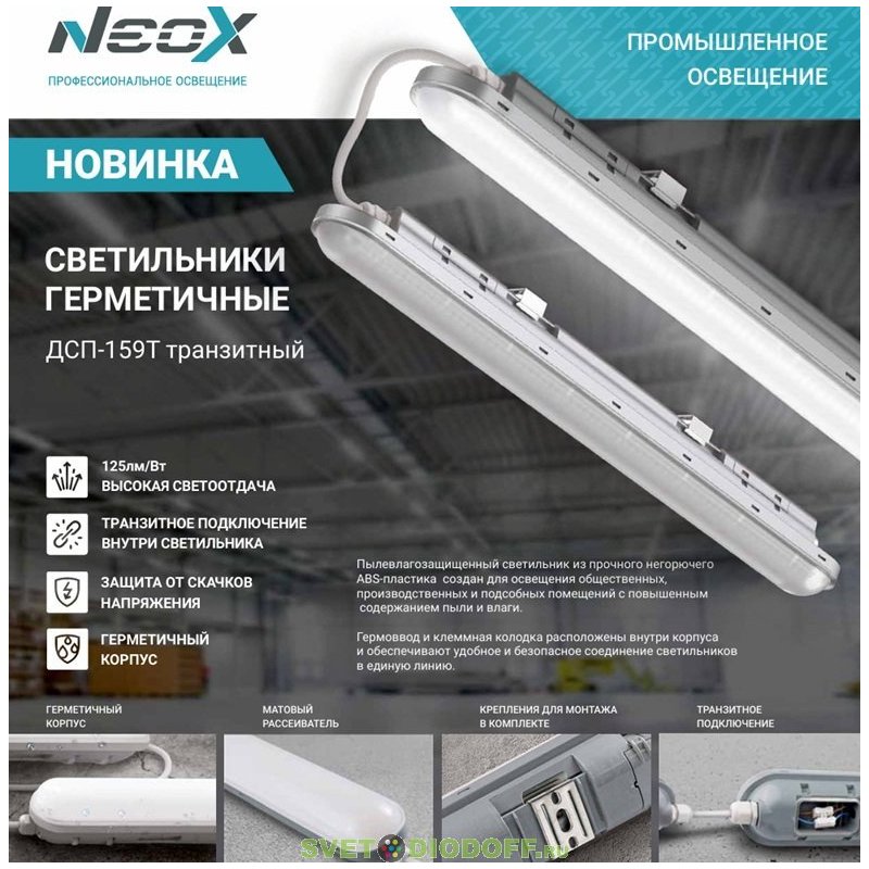 Светильник светодиодный герметичный транзитный ДСП-159Т 36Вт 4000К 125лм/Вт 4500Лм 1200х64х60мм IP65 NEOX
