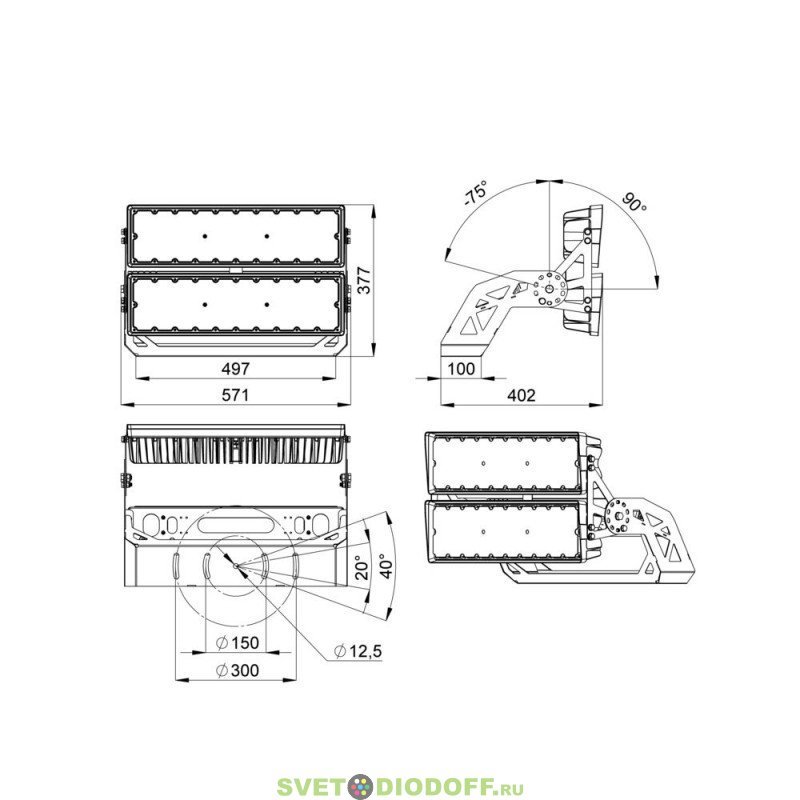 Прожектор крепится на универсальный поворотный кронштейн с возможностью регулировки угла наклона.