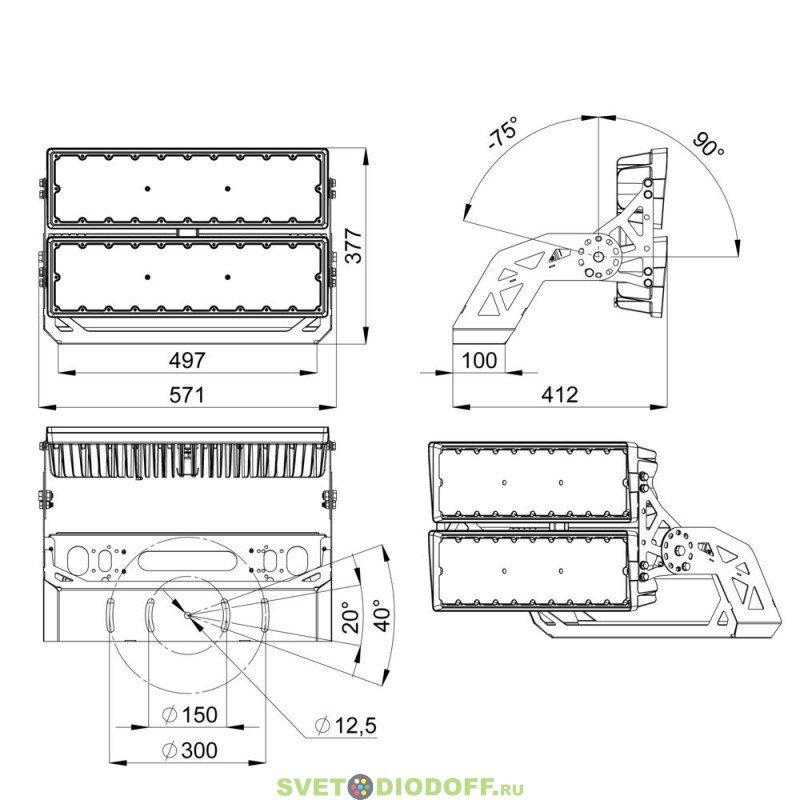 Прожектор крепится на универсальный поворотный кронштейн с возможностью регулировки угла наклона.
