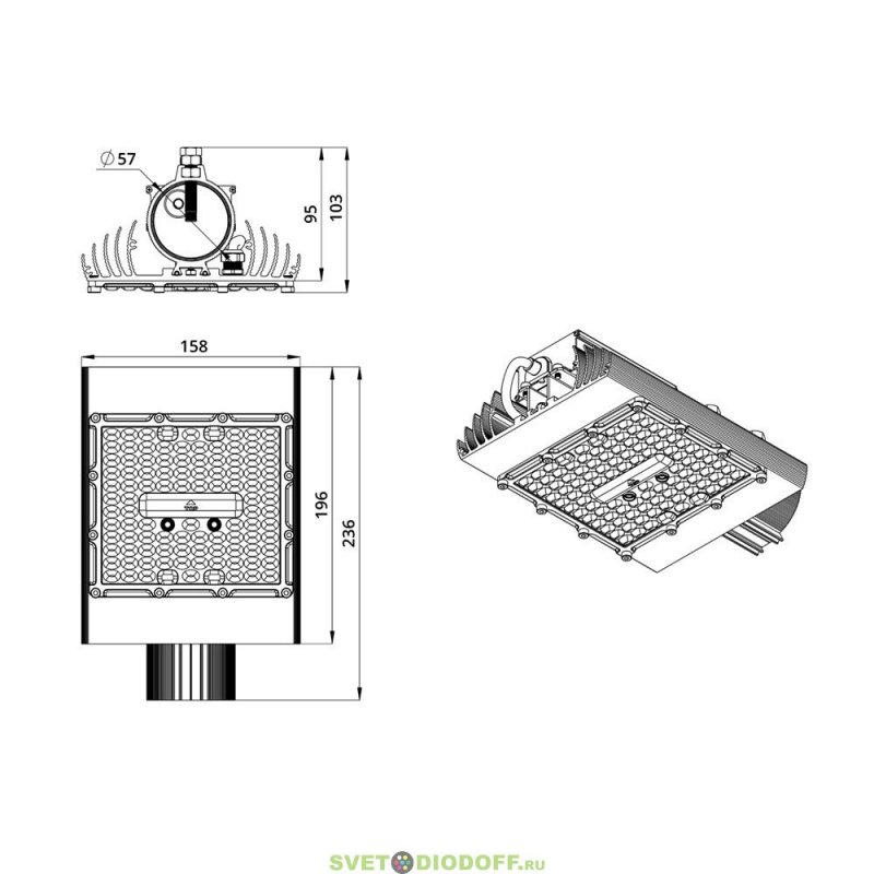 Светильники крепятся на консоль круглого сечения диаметром до 57 мм. Данная серия не имеет возможности регулировки угла наклона светильников.