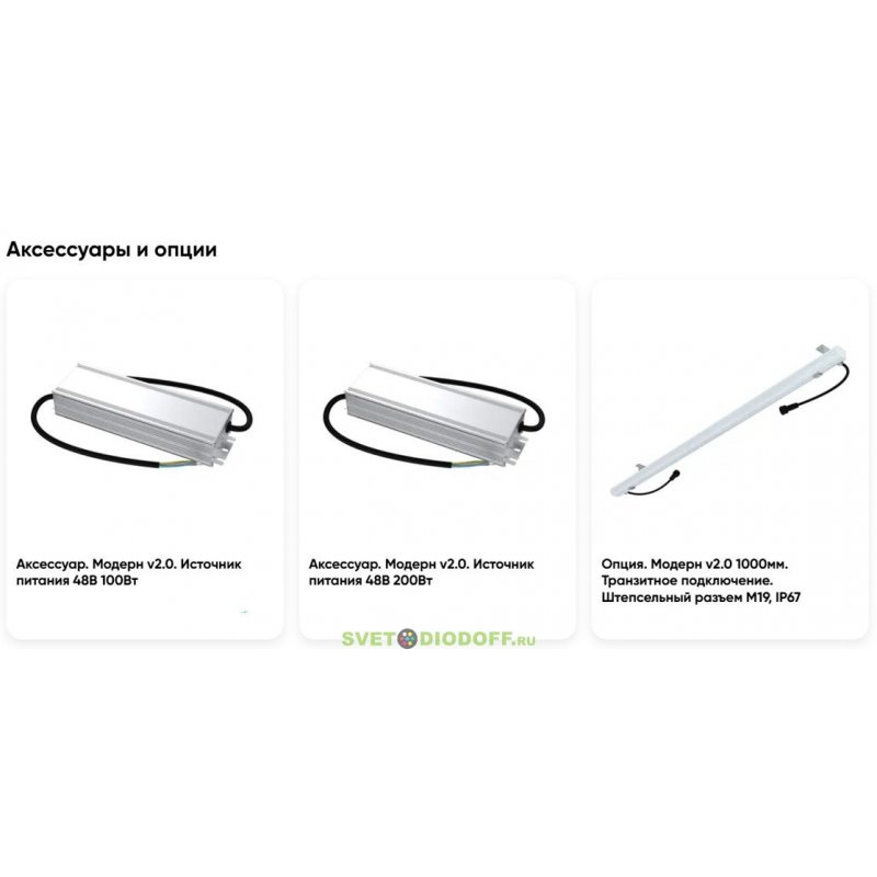 В светильнике «Модерн v2.0» используется схема питания светодиодов с применением линейных стабилизаторов с напряжением питания светодиодной платы 48 В, что позволяет обеспечить равномерное свечение от первого до последнего светильника в одной линии подключения большой длины: до 20 м для светильников мощностью 9 Вт/м, и до 30 м для светильников 6 Вт/м.