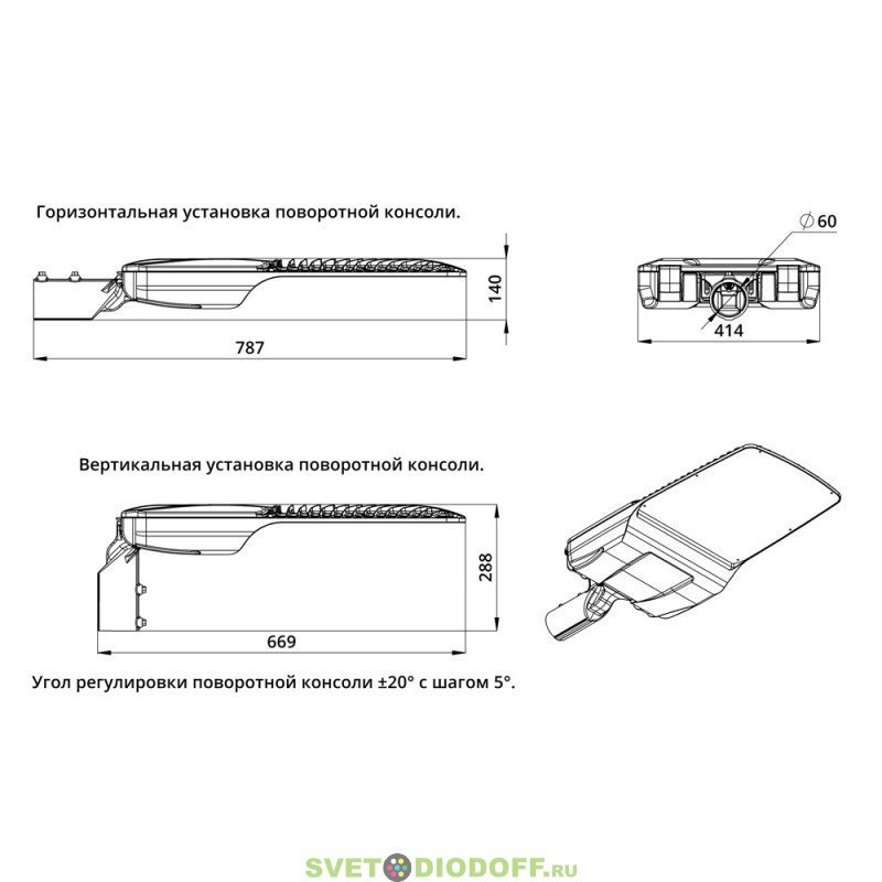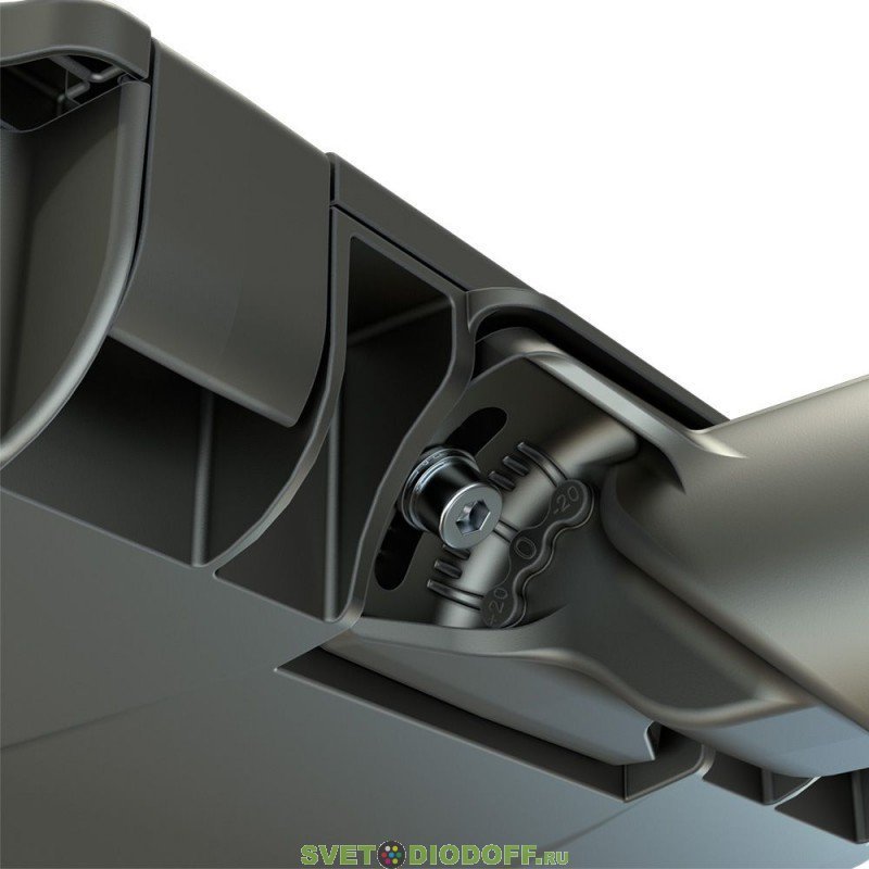 Светильники оснащены поворотным креплением, которое позволяет устанавливать их как на консольную, так и на торшерную опору диаметром от 40 до 60 мм. С помощью крепления можно регулировать угол наклона светильника в диапазоне ±20° с шагом 5°.