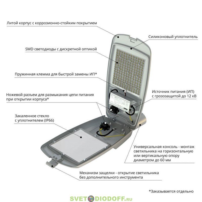 Оптическая система «светодиод-линза» создаёт КСС, обеспечивающую оптимальные яркость, коэффициенты ослеплённости и периферийности, равномерность освещения.