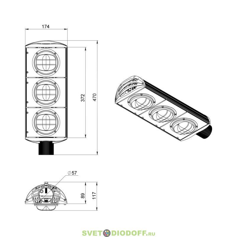 Светильники крепятся на консоль круглого сечения диаметром до 57 мм. Данная серия не имеет возможности регулировки угла наклона светильников.