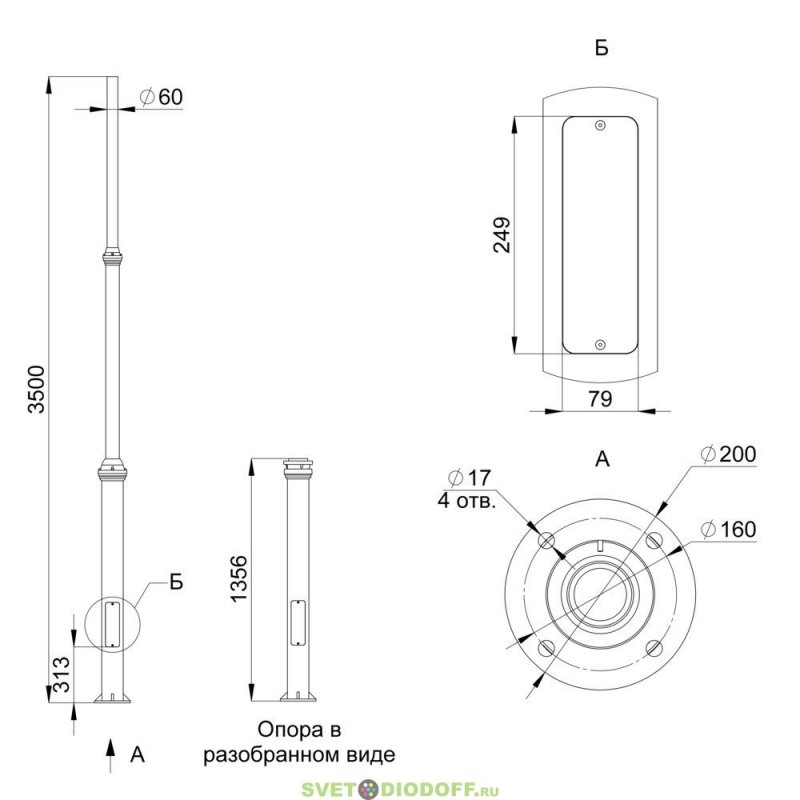 Светильник крепится на вертикальную опору. Стандартный диаметр посадочного отверстия – 77 мм. В комплекте идут крепежные болты.