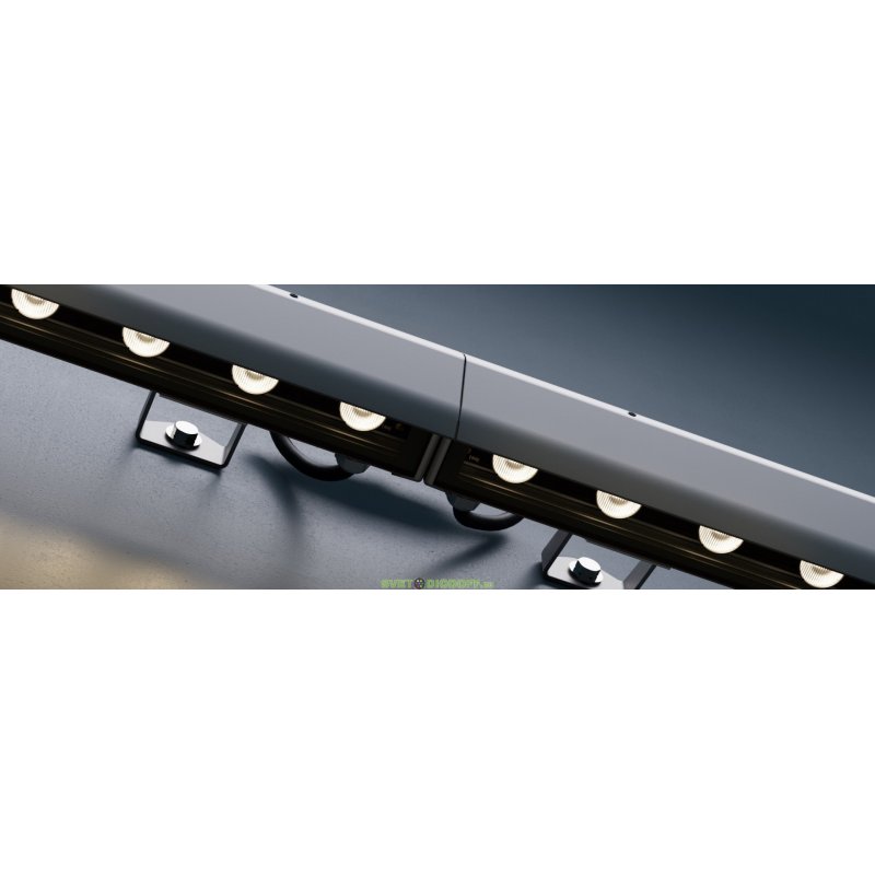 У светильников предусмотрен монтажный профиль с подвижными монтажными скобами, которые перемещаются вдоль корпуса, позволяя скорректировать точки крепления светильника. С помощью этих скоб светильники крепятся на поворотные кронштейны.