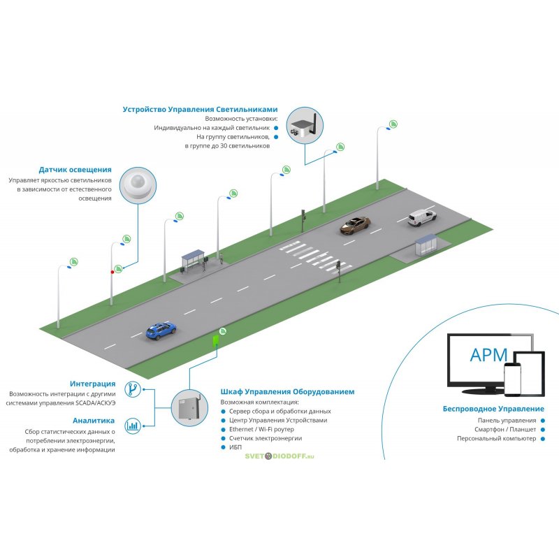 На одну из опор ставится Датчик Освещения – определяет уровень естественного освещения и автоматически регулирует яркость светильников, поддерживая необходимый уровень освещенности дорожного полотна. Датчик калибруется таким образом, чтобы не учитывать свет, исходящий от автомобильных фар и светильников с опор.