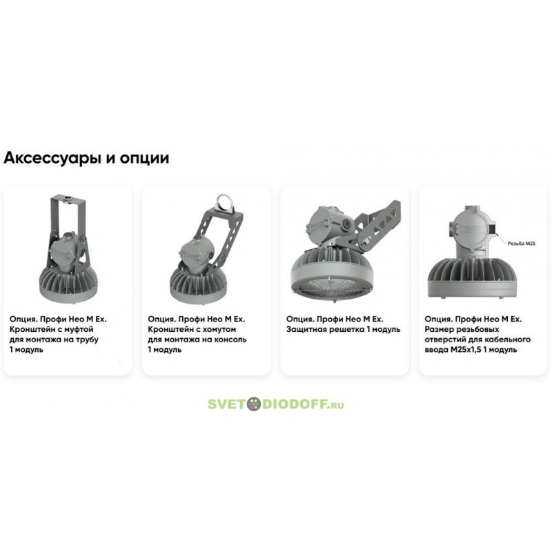 Базовые — на поворотный кронштейн, подвесное, на трубу 3/4 (этот вариант доступен только для одномодульного светильника).