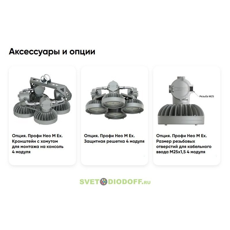Базовые — на поворотный кронштейн, подвесное, на трубу 3/4 (этот вариант доступен только для одномодульного светильника).